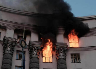 Edificio del gobierno ucraniano dañado por un ataque ruso – Kiev,...