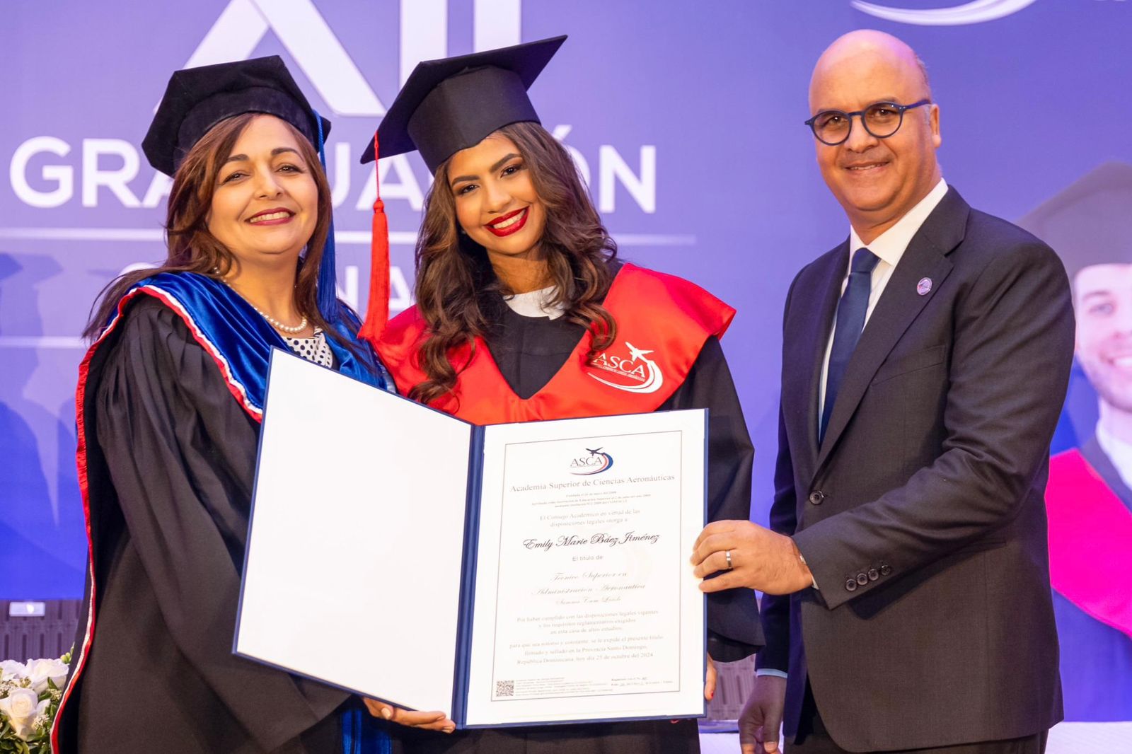 Al acto de la Décimo Segunda graduación extraordinaria de los estudiantes de la carrera Técnico Superior en Administración Aeronáutica, además del director general del IDAC, Igor Rodríguez y de la directora de la ASCA, Clara Fernández, participó el ministro de Educación Superior, Ciencia y Tecnología (MESCyT), Franklin García Fermín.