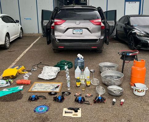 En otra acción operativa desarrollada en el sector Barrio Lindo, en La Herradura, fue arrestado el ciudadano mexicano José Romel Bañuelos Macías, a quien se le ocupó una pistola sin documentos, con su cargador y siete cápsulas, así como diversos materiales presumiblemente utilizados para la elaboración de sustancias narcóticas, incluyendo metanfetamina.