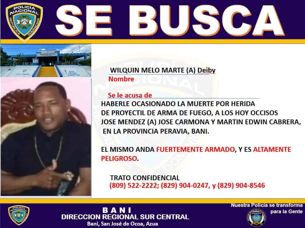 De acuerdo con el afiche de búsqueda emitido por la Policía Nacional, MeloMarte le ocasionó la muerte a JoséMéndez y a Martín Edwin Cabrera por herida de proyectil de arma de fuego en Baní.