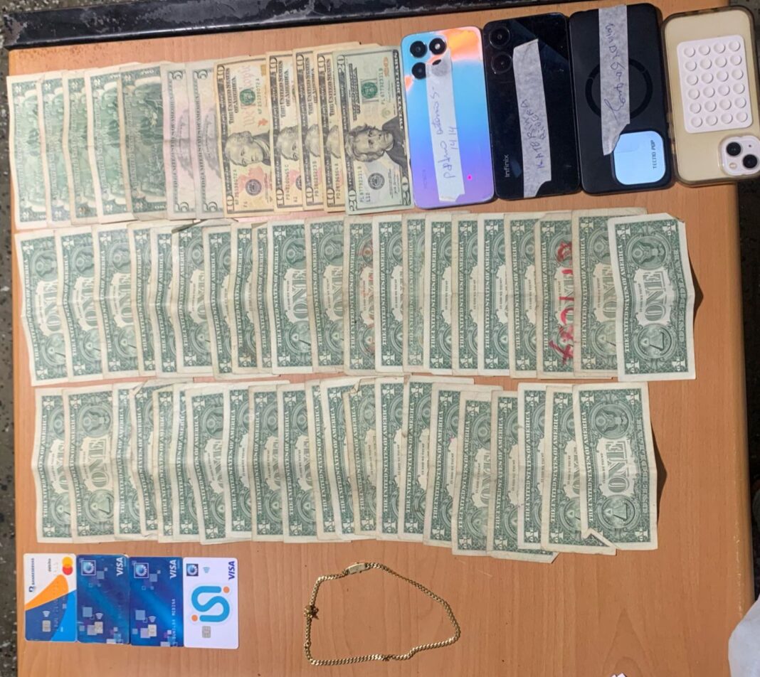 Durante el operativo, se les ocuparon cuatro celulares de distintas marcas, US$121 dólares en efectivo, una cadena tipo choker de oro 14K y cuatro tarjetas bancarias.