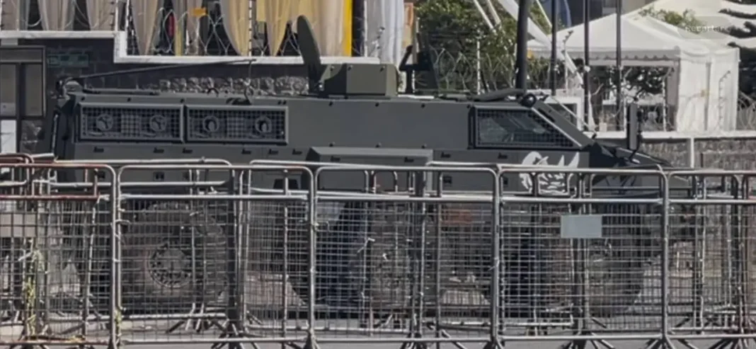 En los alrededores del CNE se desplegó un tanque con ruedas, también conocido como vehículo de combate blindado con ruedas (VCBR), una clase de vehículos militares con ruedas que se utilizan en lugar de los tanques de orugas tradicionales en terrenos pavimentados.