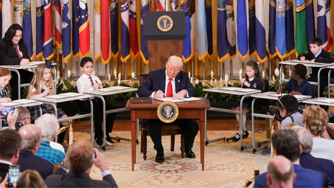 Mientras firmaba el decreto, Trump estaba rodeado de niños pequeños sentados en sus propios escritorios en la Casa Blanca, quienes simultáneamente firmaron papeles en una carpeta. Al terminar de firmarlos, se pudo ver a los niños levantando el papel para mostrarlo a la audiencia, al igual que lo hizo el presidente.