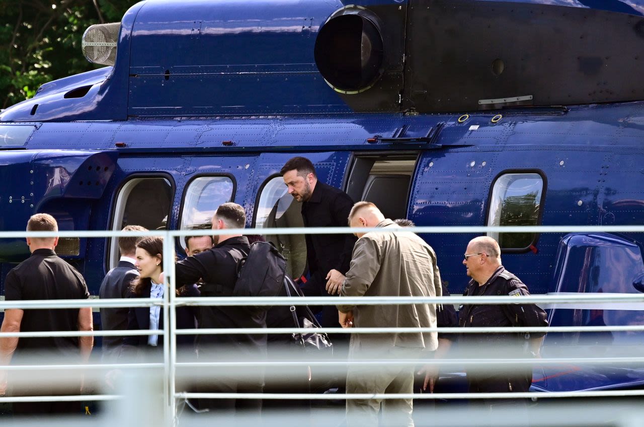 Volodymyr Zelensky desciende de un helicóptero de la policía federal a su llegada a la Cancillería para realizar consultas virtuales en Berlín hoy.