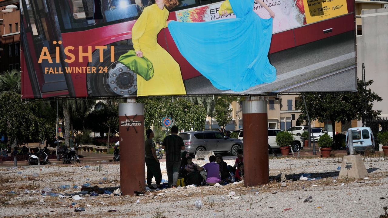Personas que huyeron del suburbio sur de Beirut en medio de los continuos ataques aéreos israelíes se refugian bajo una valla publicitaria en el centro de Beirut, Líbano, el sábado. (Crédito: Hussein Malla/AP)