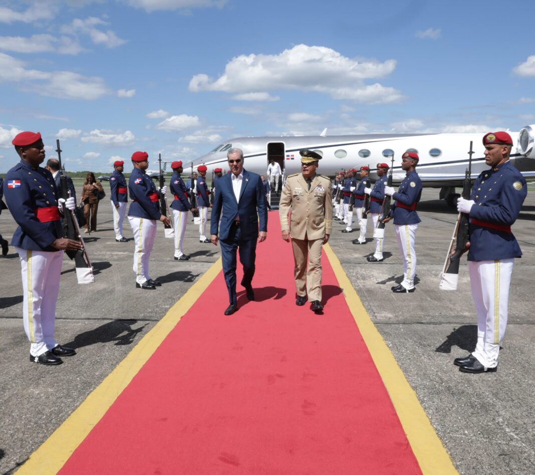 Abinader regresó por la Base Aérea de San Isidro al filo de las 15:00, hora local, y fue recibido por el ministro de Defensa, teniente general Carlos Antonio Fernández, y el comandante general de la Fuerza Aérea, mayor general Floreal Suárez.