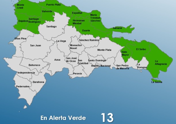 Ante esta situación, se encuentran en alerta verde las provincias de Duarte, Puerto Plata, Hermanas Mirabal, Monte Cristi, Hato Mayor, Santiago Rodríguez, Valverde, María Trinidad Sánchez, Espaillat, El Seibo, Samaná, La Altagracia y Dajabón.