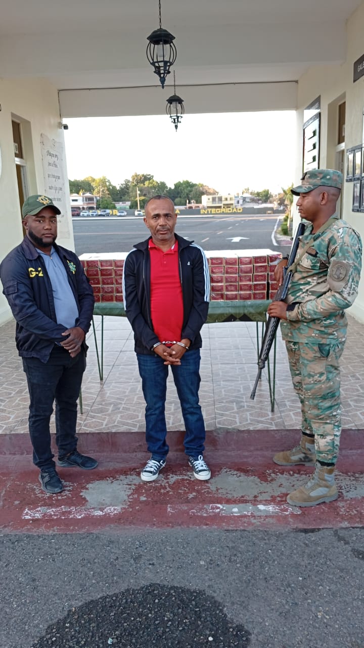 El detenido, identificado como Canelito Montero Montero, fue inspeccionado en el en el Puesto de Chequeo Km 15 de Azua, donde le descubrieron escondidos detrás de unas bocinas en el baúl de un carro Toyota Corolla placa A 507041, gris, 3 cajas de cigarrillos marca Capital, equivalentes a 30 ,000 unidades.