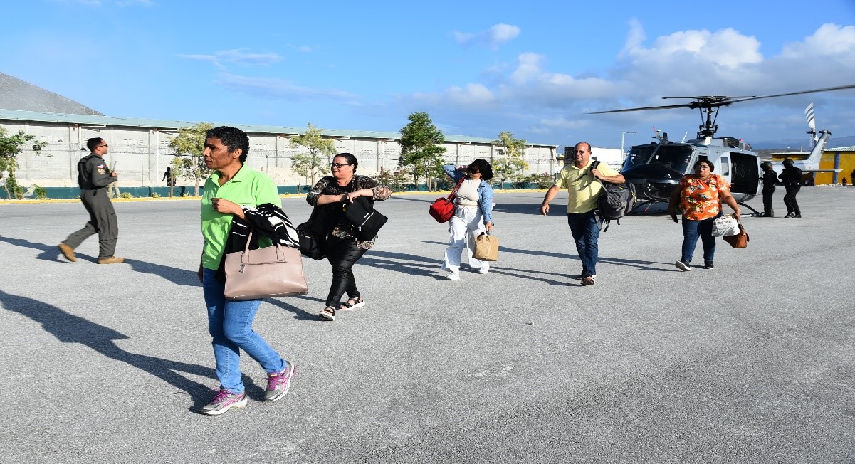 Estos dominicanos, 18 hombres, 7 mujeres y 2 menores de edad, aterrizaron en el helipuerto de la Fuerza de Tarea Conjunta e Interagencial de Jimaní, provincia Independencia, donde fueron recibidos por personal del MIREX y oficiales militares, posteriormente la mayoría de estos fueron trasladados por tierra al Ministerio de Relaciones Exteriores donde eran esperados por los directores de Protección a Nacionales y Asuntos Consulares, Miguel Reyes y Cándido Mercedes, respectivamente; oficiales de protocolo y familiares. Otros fueron llevados a diferentes provincias del país.