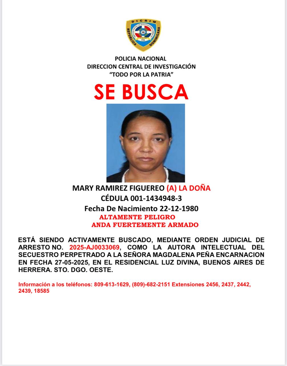 La Policía Nacional informa que mantiene activa la búsqueda de Rubén Darío Rodríguez Campos (43 años), alias El Patrón, y Mary Ramírez Figuereo (44 años), alias La Doña, ambos señalados como los presuntos autores intelectuales del secuestro perpetrado contra la señora Magdalena Peña Encarnación, ocurrido el pasado 27 de mayo del presente año, en el residencial Luz Divina, ubicado en el sector Buenos Aires de Herrera, municipio Santo Domingo Oeste.
