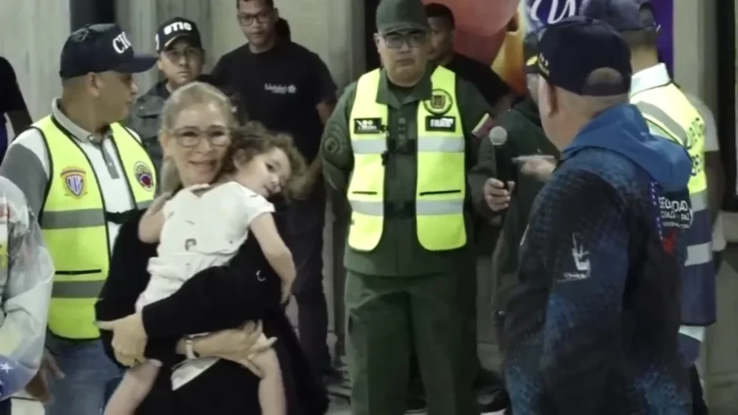 La primera dama de Venezuela, Cilia Flores, llevaba a la niña de dos años en brazos mientras las autoridades anunciaban el regreso de la menor ante la prensa reunida en el aeropuerto.