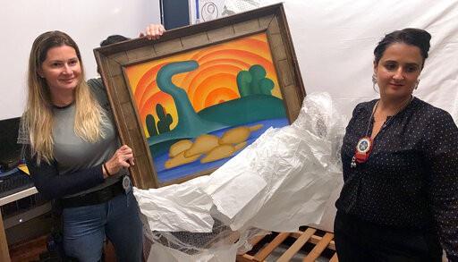En esta foto difundida por la Policía de Río de Janeiro, agentes muestran la obra Sol Poente, de Tarsila do Amaral, confiscada en una operación policial, el 10 de agosto del 2022. El cuadro es uno de 16 obras de arte valoradas en 139 millones de dólares y que fueron robadas a una viuda.